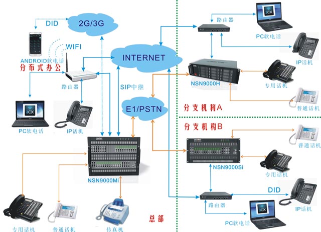 NSN9000Mi机型支持外线为模拟中继、数字中继、无线中继、SIP中继等多种接入方式,内线分机可接入传真机、无绳话机、专用话机、IP话机、IP网关等多种终端设备。支持目前公司产品全系列专用话机接入,且操作方式完整的继承了传统的数字程控用户交换机的操作模式,简捷方便。