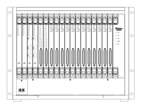 机框为19英寸标准机箱,可选择壁装和标准机架安装。环路中继和用户可实现在规定容量内任意配置。各单元板排序为MCU->CCS->FXO->FXS->PWR,见下图。